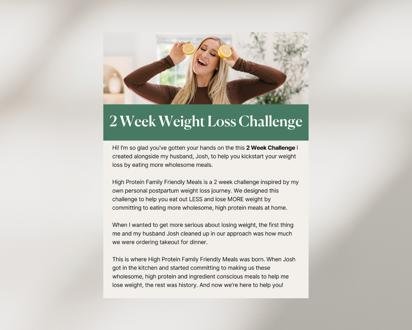 This is because the first thing my husband Josh and I did to support my postpartum weight loss goals was reel in how much we were eating out... which is how the High Protein Family Friendly Meals recipe & challenge guide was born. Each recipe is wholesome, high protein and ingredient conscious to help you lose weight and enjoy every meal.